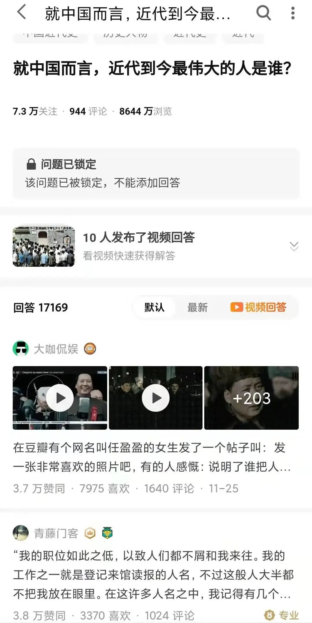 但在被锁定前,已经被浏览了8643万次,有1.7万人写了回答,另外还有上万人为这个问题的提出者点了赞,认为这是一个“好问题”。