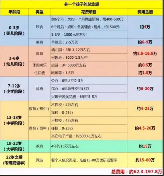 (有人计算,养一个孩子总花费钱,在 62 万到 198 万之间)