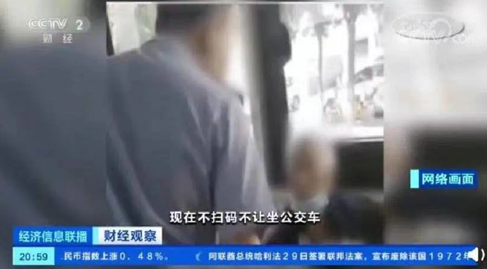 (2020年,一位老人乘公交车时因没有手机,无法扫健康码,被司机停车拒载 | 图源:央视财经 )