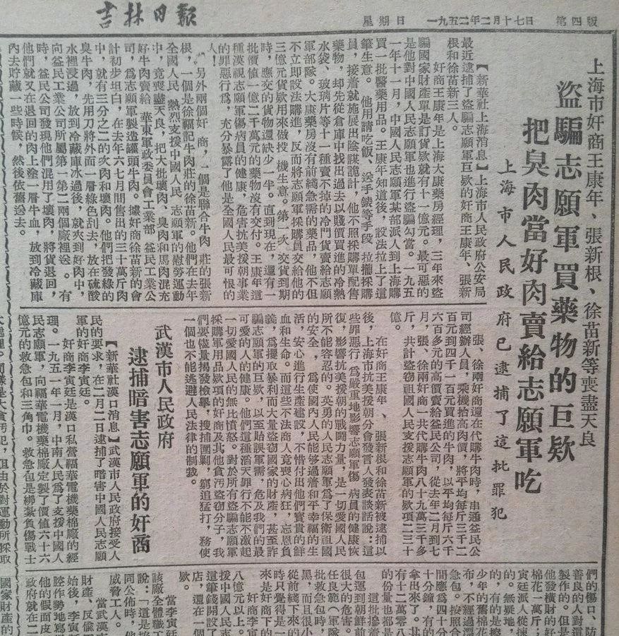 3、上海大名路联合牛肉庄奸商张新根和陕西北路徐福记牛肉庄奸商徐苗新两人,在为志愿军承做牛肉罐头期间,竟然用水牛肉和马肉冒充好的黄牛肉,私吞人民财产三十亿元。这还不算,为了进一步榨取利润,这两个奸商竟然买来一千斤臭牛肉和坏牛肉制作牛肉罐头。有些臭牛肉表面发绿,为了掩盖,他们就在表面涂一层牛血,当做好牛肉送给志愿军。许多志愿军吃了这些坏牛肉之后,纷纷中毒、患病。最终,这两人也被枪毙。