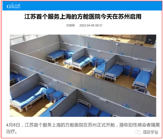 光明网报道,4月8日,江苏首个服务上海的方舱医院在苏州正式开舱,接收阳性感染者隔离治疗。