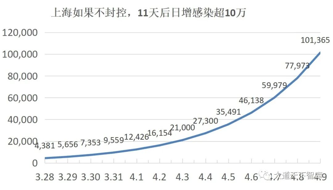 上海如果不是在3月28日开始防控,继续按感染人数每天30%增长的话,只需11天就会日增超过10万。