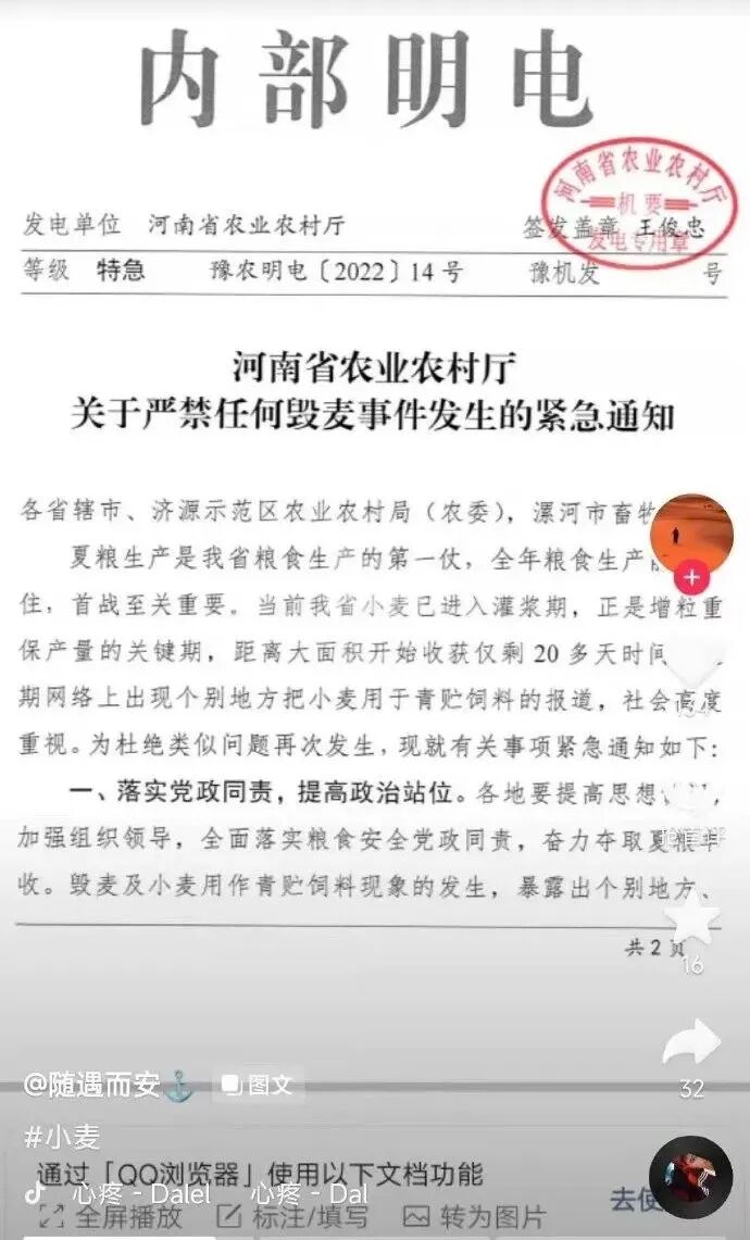 有网民还放出了所谓的河南省农业农村厅的一份“关于严禁任何毁麦事件发生的紧急通知”。
