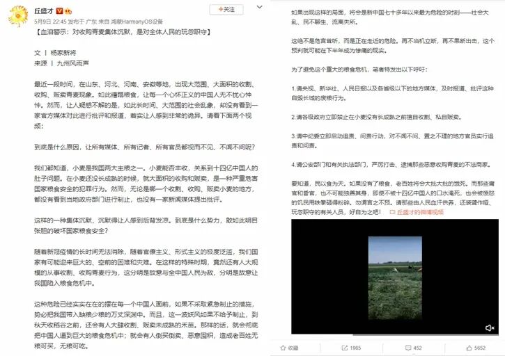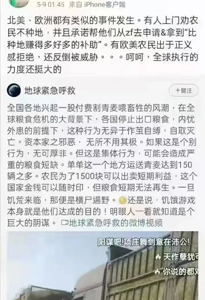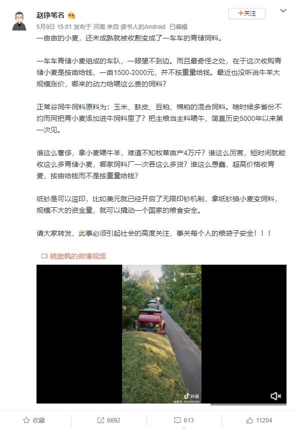 下面这位知名博主,说的更为严重:山东、河北、河南、安徽等地,出现大范围、大面积的收割、收购、贩卖青麦现象……在这样的特殊时期,竟然还有人大规模的从事收割、收购青麦行为,这分明是故意与全中国人民为敌,分明是故意让我国陷入粮食危机中。