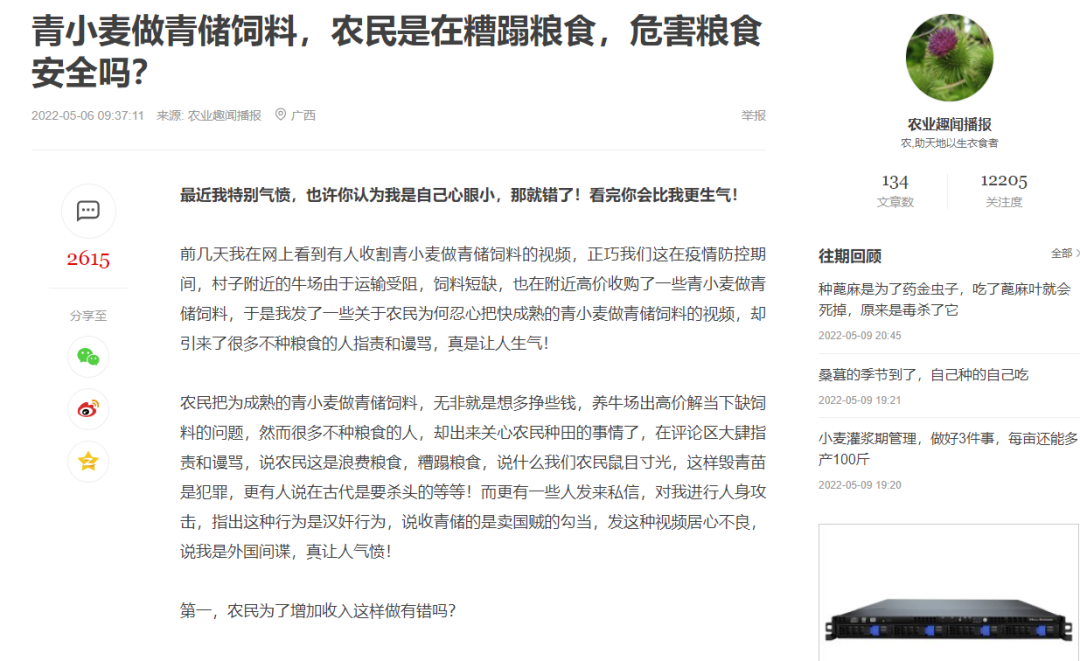 比如有名为“农业趣闻播报”在网上撰文,却声称是因为“村子附近的牛场运输受阻,饲料短缺,在附近高价收购青小麦当饲料”,并指农民出售青小麦“是想多挣些钱,还能解决牛场缺饲料问题”,还声称“把青小麦变成肉不会造成粮食危机”。