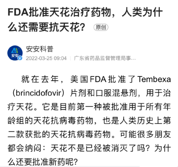 第二条:2021年3月,美国FDA批准一种用于治疗天花的片剂和口服混悬剂,被称之为第一种被批准用于所有年龄组的天花抗病毒药物,也是人类历史上第二款获批的天花抗病毒药物。