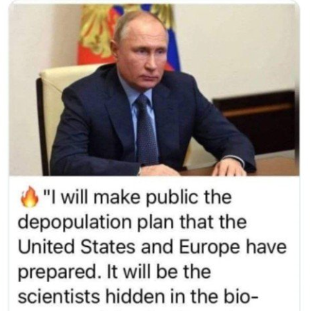 昨天网上还流传一张截图,截图上显示普京在昨天的一句话:”我将把美国和欧洲制定的人口灭绝计划公布出来。那些藏在被发现的生物实验室里的科学家们将把一切都揭露出来,他们现在就在莫斯科。“