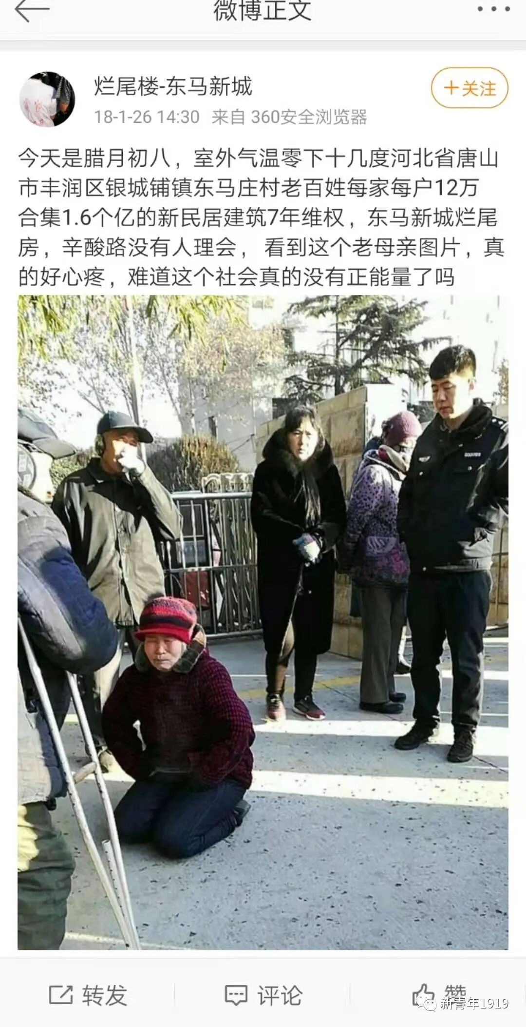 一位东马庄村老天太跪地维权的图片,地点、楼盘名称、金额1.6亿元完全吻合。