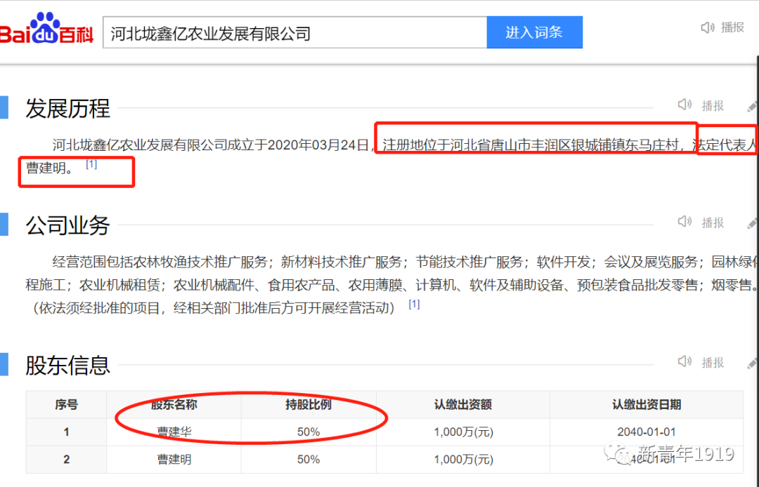 检索这几个字,惊讶的发现,该公司全称为“河北垅鑫亿农业发展有限公司”,法人叫曹建明,注册资本2,000万元,曹建华是股东之一,持股50%。