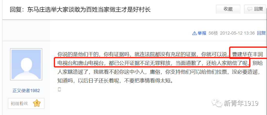 不过另一位网友@正义使者1982 很不服气,站出来继续反驳道:曹建华在丰润电视台和唐山电视台,都已公开证据不足无罪释放,当面道歉了,还给人家赔偿了呢。