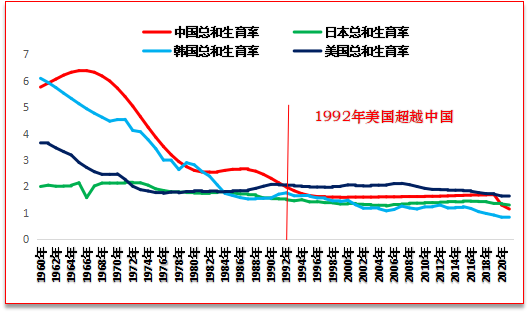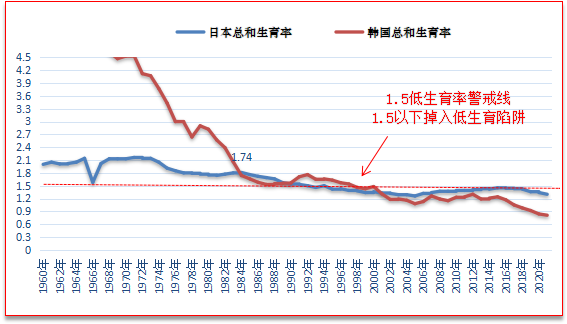 查询资料,美国对韩国粮食市场掌控,通过专项援助方式,约在1970年左右完成;对日本粮食市场掌控,在1965年左右。梳理两者总和生育率数据形成如下曲线图: