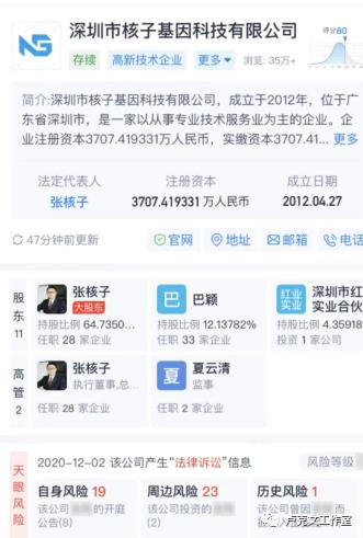 2012年,夫妻二人成立了深圳核子基因,公司主做司法鉴定这块市场,张核子占股64.7%、巴颖占股12.1%