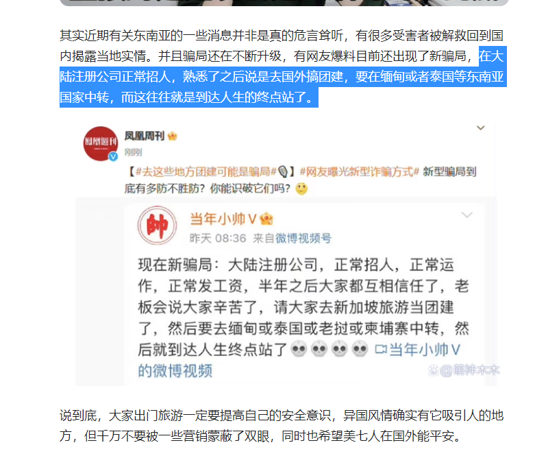据凤凰周刊揭露,现在已经有一种新的诈骗形式。他们在大陆正常开公司,正常招募员工,正常发工资。等跟员工把关系混熟后,他们就以团建的名义,组织公司员工一起去新加坡旅游,中途就说要在缅甸或者泰国转机。可从你在泰国、或者缅甸落地的那一刻开始,你可能抵达的就是人生的终点。