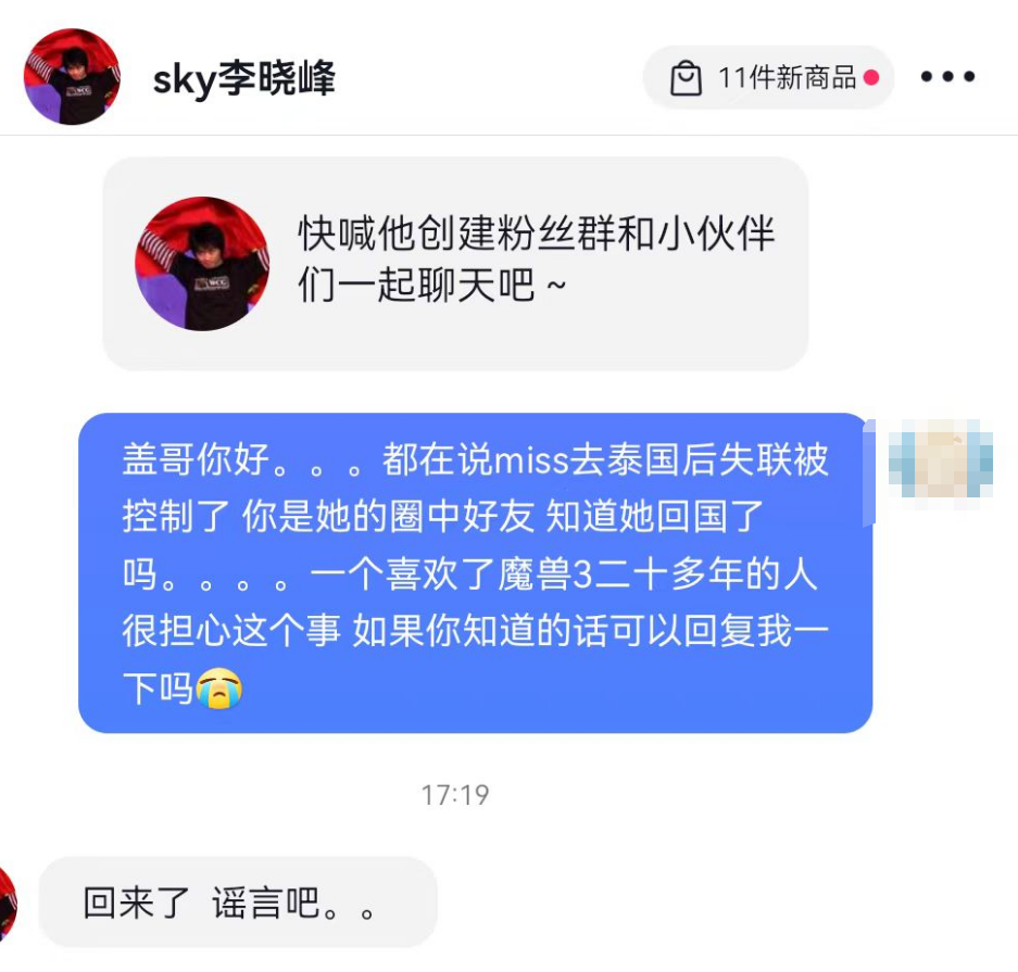 关于电竞女王miss有没有回国,队长的一个好朋友特意去人皇Sky的抖音账号中私信咨询了一下。Sky亲自回复了这条讯息说:“回来了,谣言吧。”