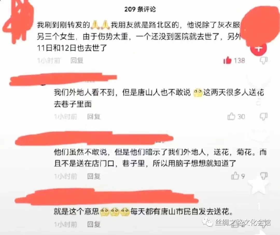 网传:烧烤店暴力围殴女性案的主犯陈继志从烧烤店侧面的小巷子出来后浑身是血,吓得其她三个女孩全部冲进了小巷子。这个细节可以说明:当场有一个女孩已经被陈继志杀害了!再看看上面图二中,小巷子路面上残留的几摊血迹,基本可以还原事发现场:陈继志等人将其中一个女孩强行拖去二楼轮奸,然后从二楼将女孩扔下,再用汽车碾压女孩致死……图三为唐山市民在事发后前往烧烤店侧面的小巷子献花祭奠,为何献花?为何偏偏在小巷子案发现场献花?