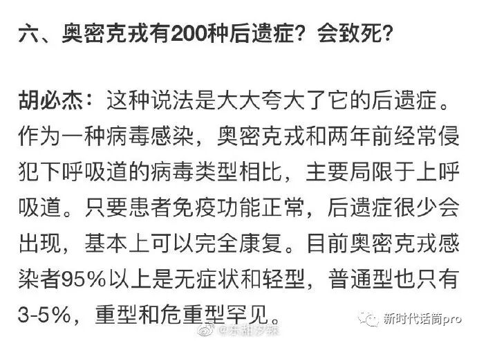 张主任的同事,胡必j 在4月2日接受采访回应公众关注的问题时称:奥密克戎后遗症很少,只要免疫功能正常,基本没有后遗症,并且无症状和轻症的无需药物治疗。
