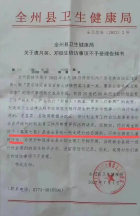 全州县卫健局给唐月英夫妇的回函,直接以“当年政策”,年代久远,历史原因,不予处理。